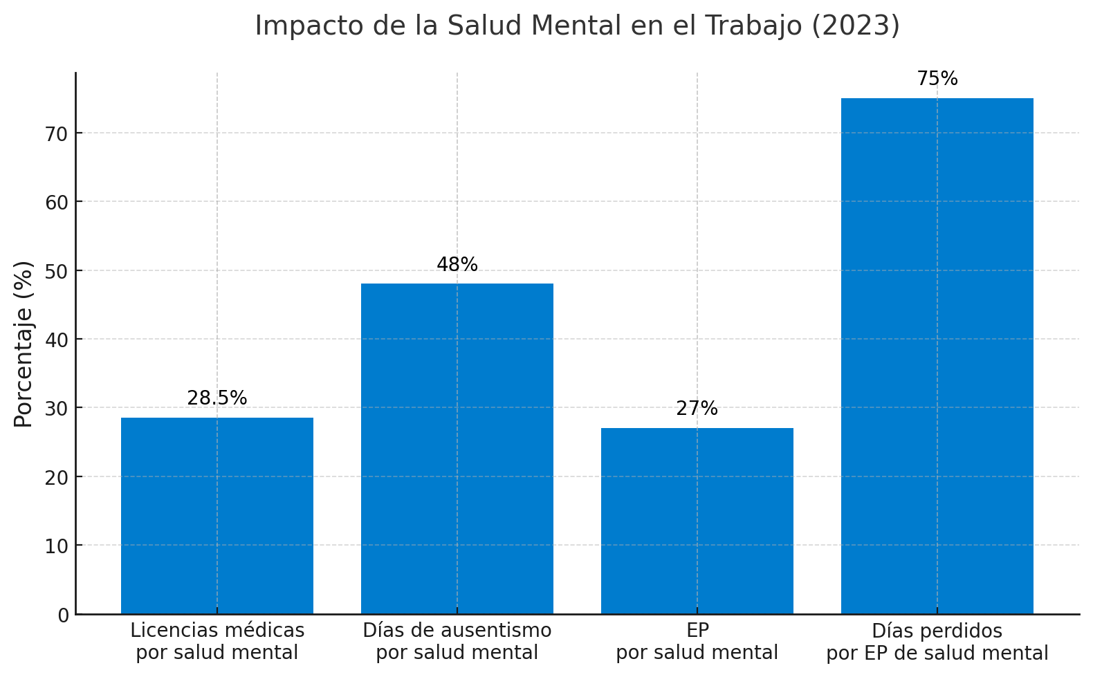 En cuanto a las licencias médicas por trastornos mentales y del comportamiento, representaron el 28,5% del total de licencias médicas curativas emitidas, acumulando el 48% de los días de ausentismo laboral en el sector, lo que equivale a 3.135.259 días perdidos en el periodo. Además, las enfermedades profesionales (EP) relacionadas con la salud mental representaron el 27% de todas las EP calificadas, siendo responsables del 75% de los días perdidos por estas causas (53.307 días).